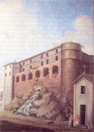 Il palazzo-scogliera-fontana di Monterano com'era nel 1781. Affresco di Giuseppe Barbieri nel palazzo Altieri di Oriolo Romano.